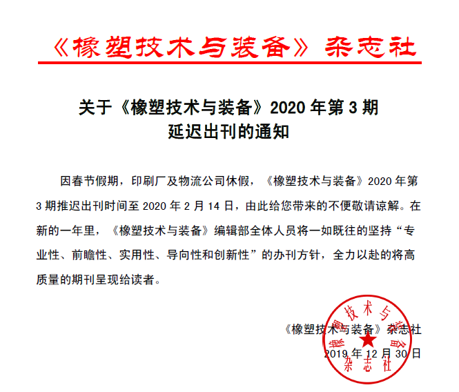 【通知】關(guān)于《橡塑技術(shù)與裝備》2020年第3期延遲出刊的通知因春節假期,印刷廠(chǎng)及物流公司休假,《橡塑技術(shù)與裝備》2020年第3期推遲出刊時(shí)間至2020年2月14日,由此給您帶來(lái)的不便敬請諒解。在新的一年里,《橡塑技術(shù)與裝備》編輯部全體人員將一如既往的堅持“專(zhuān)業(yè)性、前瞻性、實(shí)用性、導向性和創(chuàng )新性”的辦刊方針,全力以赴的將高質(zhì)量的期刊呈現給讀者。 《橡塑技術(shù)與裝備》雜志社 2019年12月30日 2019-12-30 【中心動(dòng)態(tài)】